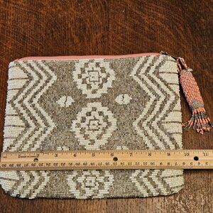 10"x8" Never used Jasper & Jeera beaded clutch pink interior with white and silver/gray Native beaded pattern. Very clean. No beads missing