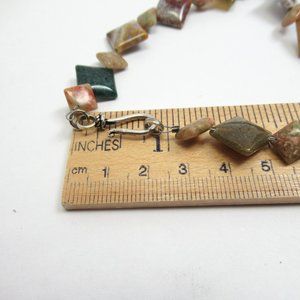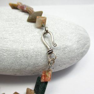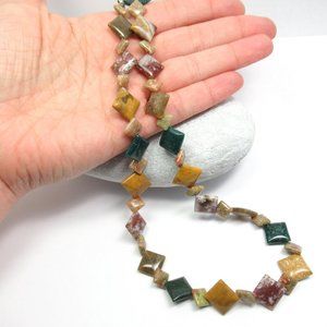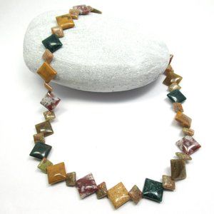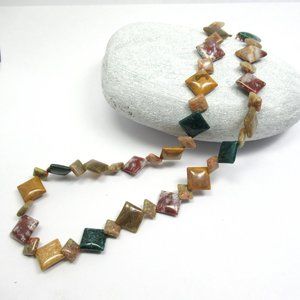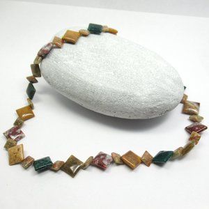 This listing is for the Mixed Jasper gemstone bead necklace pictured. It is 18 inches long and finished with a 925 Sterling silver Bali style hook clasp. This piece was made by me, from beautiful Jasper angle drilled diamond overlapping beads in two sized and is strung on quality beading cord with Sterling findings. It is in good condition.