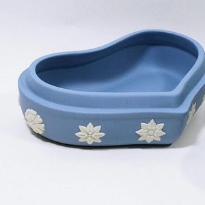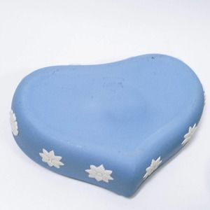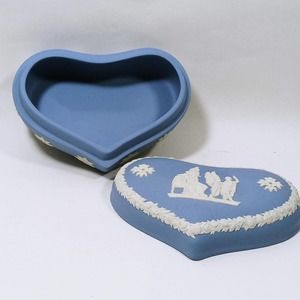 Vintage Jasperware Wedgewood Covered Heart Shape Dish Blue & White Trinket Box Embossed Queensware (4c)