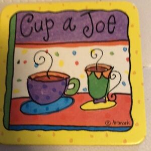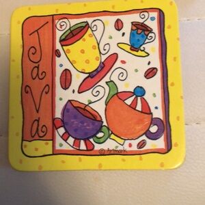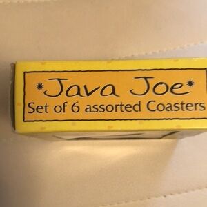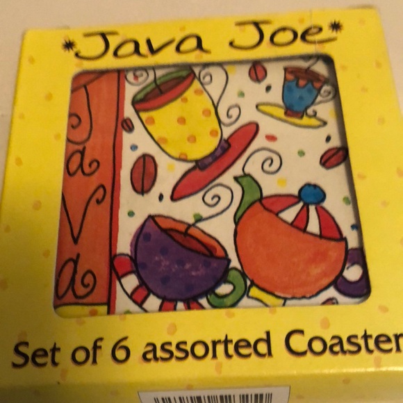 Set of 6 colorful Java Joe coasters. Features vibrant designs with coffee themes.