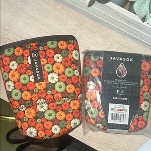 Javasok cup sleeve with a colorful pumpkin design. Features orange, green, and black hues. The large was opened but never used. It’s too big I don’t buy large drinks