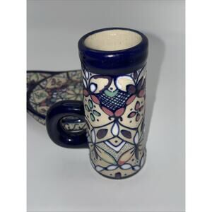 This Javier Servin hand-painted Talavera handled shot glass with serving tray is a beautifully crafted piece of Mexican pottery. Handmade in Mexico, this collectible item showcases traditional Mexican design and culture. The Talavera style, known for its intricate pottery, is evident in the detailed craftsmanship of the shot glass and tray. Perfect for collectors or those looking to add a touch of Mexican culture to their home decor, this piece is a unique and artistic addition to any collection.