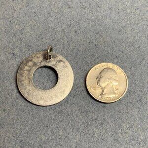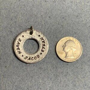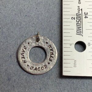 Silvertone, slightly hammered look, washer shaped ring pendant charm with the names JAVIN JACOB ETHAN engraved! Quarter for size reference, not included. No markings unless shown.