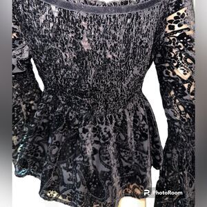 Jawbreaker low square neck smocked waist, smocked bell sleeves, velvet/mesh top
