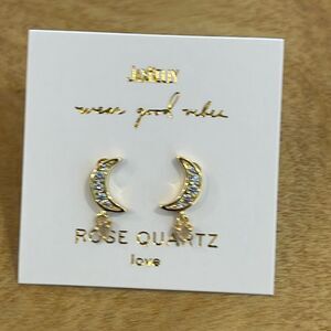A CZ-encrusted moon stud has a petite gemstone hanging from the center. Known as the love stone, Rose Quartz amplifies the essence of love and opens the heart on all levels.