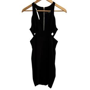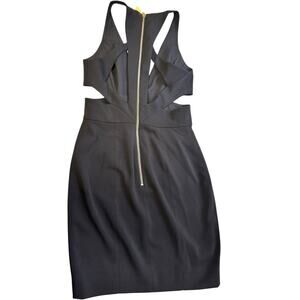 Jay Godfrey Black Cutout Knee Length Cocktail Dress. Stretchy form fitting sheath dress with an exposed gold tone zipper. This dress has cutouts in the front and upper back. Great for a fun night out!