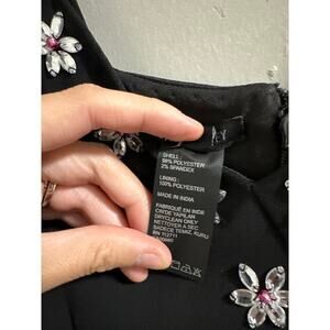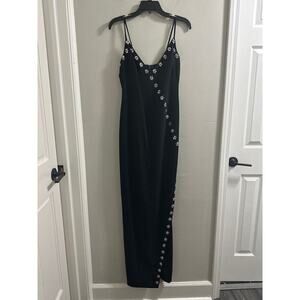 Jay Godfrey beautiful and classic black embellished gown with spaghetti straps and slit- flowers are silver beads with pink centers