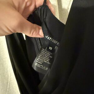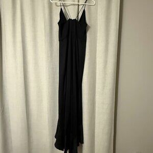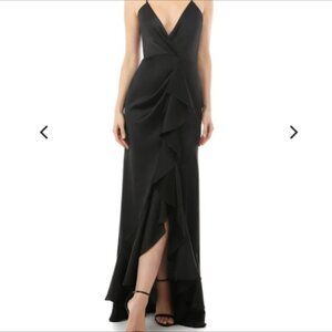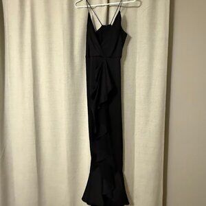 Elegant black gown with ruffle front detail and flattering silhouette — perfect for formal events or weddings.