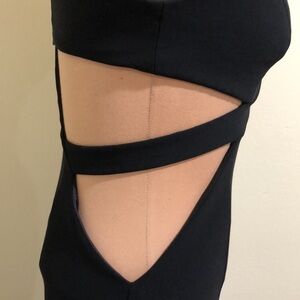 Very good condition no stains rips or fading. Some loose threads by the cut outs. Sleeveless, plunge v-neck, cut out sides, trumpet mermaid silhouette gown. Zips in back. No padding or boning. Stretchy material and is modeled on a mannequin with 36.5” bust and 28.5” waist. There is a sticker on the brand tag because it was purchased from a clothing rental.