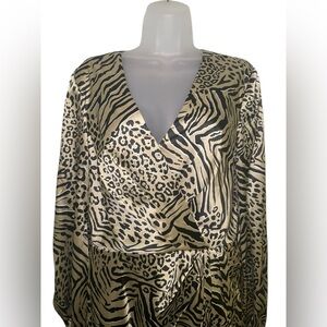 Striking and sophisticated, this Jay Godfrey dress features a bold mixed animal print in gold and black. Designed with a flattering V-neckline, long sleeves with elastic cuffs, and a draped front detail for a figure-enhancing fit. Crafted from high-quality fabric with a silky finish, this dress transitions seamlessly from daytime events to evening outings.