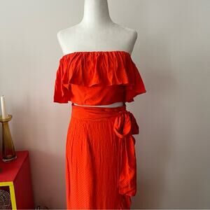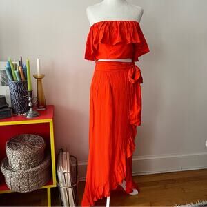 100% viscose. Dry clean only. Elasticized neckline. Boned bodice. Wrap design skirt with hook and eye closure. Waist tie detail. Two-piece set. Skirt measures approx 45" in length. In good preowned condition.