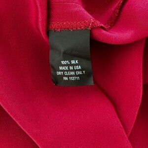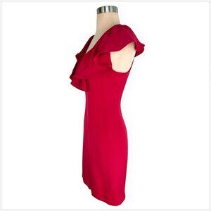 Back zip closure. Fitted sheath style. Adorable ruffled collar neckline. Red stretch silk fabric for a great fit.