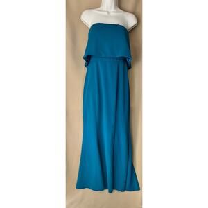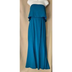 Teal blue crepe strapless gown. 98% polyester 2% spandex. Straight neckline. Hidden back zipper with hook and eye closure. Fully lined. Boned bodice.