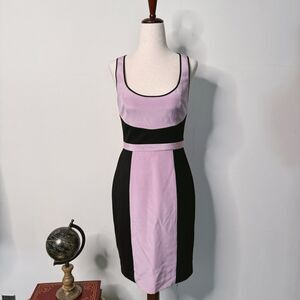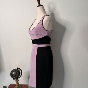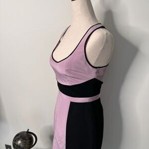 Jay Godfrey silk sleeveless mini dress, bodycon style with flattering color blocking in black and lilac. Deep scoop neck. Racer style back. 100% silk.