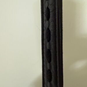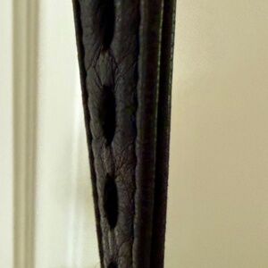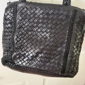 Exterior is diagonally shaped woven leather with sewn accent on sides. Bottom is made of smooth black leather. Shoulder strap is made of black leather with black accent stitching in center.