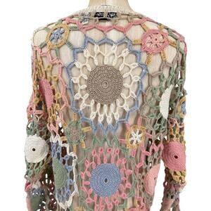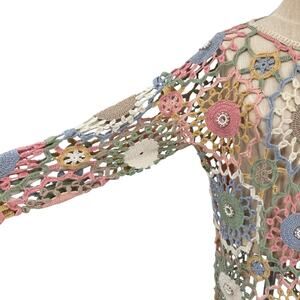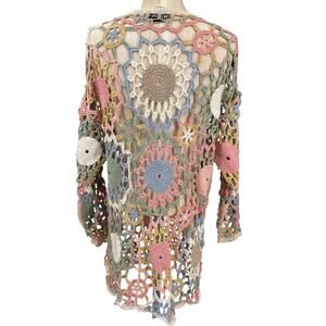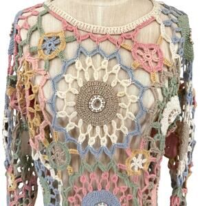 Beautiful vintage Jay Jacobs hand-crocheted knit tunic or coverup dress in a soft pastel color palette. Features intricate circular floral motifs with openwork mesh and delicate bead accents throughout. A stunning boho piece perfect for layering over a slip, wearing as a beach coverup, or styling for a festival look.