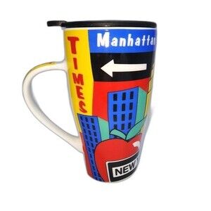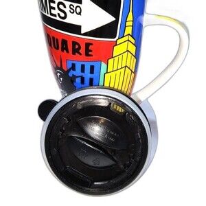 Jay Joshua New York NWOT Porcelain New York Themed Travel Mug. In bright, primary colors, this mug celebrates the tourism side of NYC. It includes Times Square, The Empire State Building and The Statue of Liberty. The mug is large at 6 inches tall, and it has a circumference of 2.5 inches at the base and 3.5 inches at the top. It has a well-fitting lid that sits inside, and the lid has a seal to keep the hot liquid where it belongs. The lid twists left and right to open and close. Looks to hold at least 16oz. Made of porcelain, hand washing is recommended, avoid microwaving.