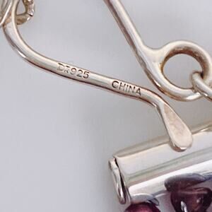 Features: Signed "DTR" and stamped "925"; multi-strand construction; garnet in rich wine and purple palette; pairing of natural gemstone in chips and polished rounds; adjustable extender chain; sterling silver hook clasp, end bars, extender, and heart charm; layered drape across neckline; substantial construction consistent with designer's reputation