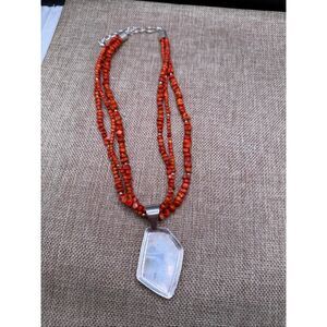 The pendant hangs from three strands of natural orange sponge coral beads accented with sterling silver findings.