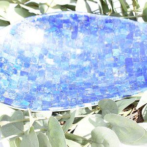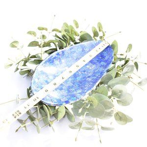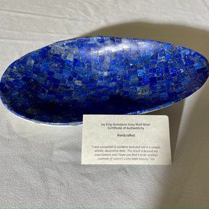 From Jay King, a beautiful blue lapis is inlayed in a shell. The designer refers to this as a bowl but I would call it more of a trinket tray due to its shape and size. All photos are of the item you will receive.