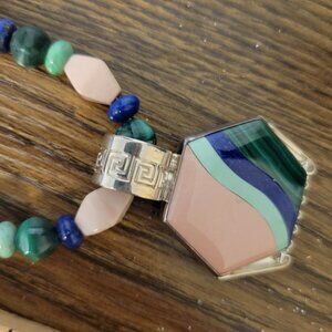 Make a chick style statement with this colorful multi-gemstone pendant and necklace. The gallery worthy design features natural pink opal, green variscite, blue lapis and green malachite.