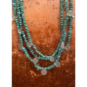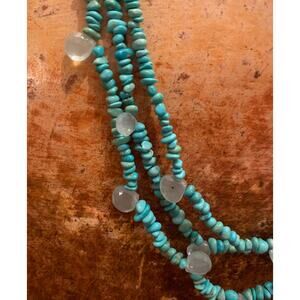 Jay King multi strand sterling silver, turquoise and quartz necklace. Three strand blue turquoise polished chips with faceted light blue quartz teardrop shape spread throughout. Necklace measures 18 inches long plus a 3 inch extender. Marked DTR and 925.