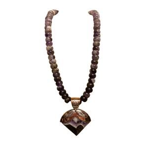 This Jay King Necklace & Pendant is a stunning statement piece made of sterling silver, copper, and featuring an asymmetrical amethyst pendant in a beautiful purple color. The necklace is signed by the brand Mine Finds by Jay King and has a hook closure for easy wear. With a necklace length of 18 inches plus a 3-inch extender, this piece is perfect for various occasions such as engagements, weddings, anniversaries, birthdays, and many more. The adjustable necklace is crafted with high-quality materials and is sure to make a bold statement with its unique design. Marked DTR and 925.
