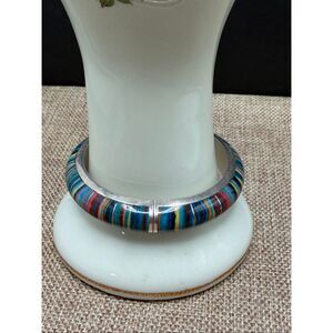 From designer Jay King – Mine Finds, this striking sterling silver hinged bangle bracelet showcases a vibrant inlay of genuine stones including turquoise, lapis, spiny oyster, coral, and onyx. The multicolor striped design makes it a true statement piece.