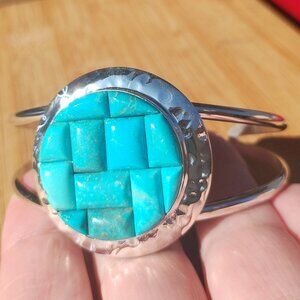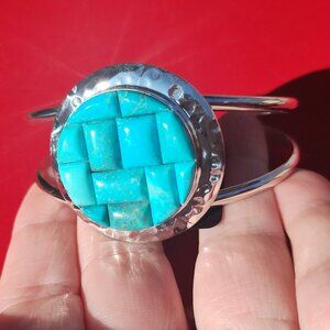 A three dimensional inlay design of Andean Blue turquoise gives this chic, sterling silver cuff bracelet a fun, artistic vibe.