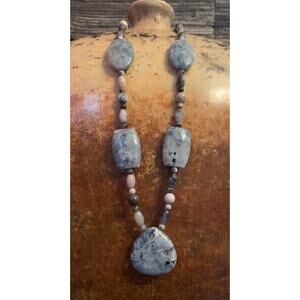 Statement piece!!! Jay King sterling silver and dendritic agate necklace. Necklace has different shapes, sizes and colors of stone. Shape include barrel, round, oval, rectangular and more. Sizes are small to large. Colors include grey, white, brown and black. Necklace measures 24 inches long and 1.75 inches wide at widest. Marked DTR and 925