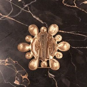 Made exclusively for Neiman Marcus, this golden accessory features green enamel and Swarovski crystal embellishments. It stands on its own with a tear metal stand or clips onto clothing. The tiny, but ornate gilt metal frame looks great as statement jewelry, a scarf pin or piece of home decor.