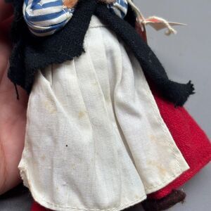 Vintage handmade Irish character doll by Jay of Dublin, representing a traditional Donegal woman. Features include a striped blouse, red wool skirt, white apron, black shawl, and a hand-painted composition face with white mohair hair styled in a bun. The doll has a soft felt body with internal wire armature, making her slightly poseable. Includes original hang tag and sewn-in label. A charming representation of Irish regional heritage.