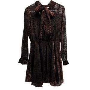 charming neck tie and swingy skirt. Long sleeves. High neckline with tie. Hidden back zipper closure.