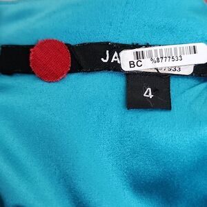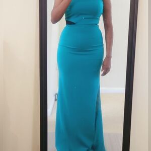 Teal crepe (98% Polyester, 2% Spandex). Sleeveless. Crew neckline. Fitted skirt with side cut-out at waist. Exposed back zipper. Lined. See size and fit tab for length. Imported. worn once.