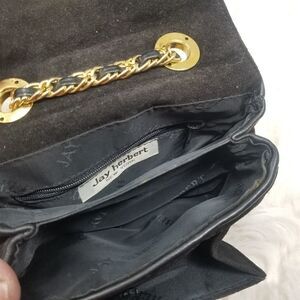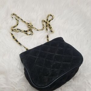 Good clean used condition. The bag is a black velour with heavy gold look chain. Approximate measurements are 6" x 5" x 2.25". Strap is approximately 46". Vintage.