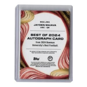 This 2024 Best of Bowman autographed football card features Jayden Maiava, the quarterback from USC. The card showcases a vibrant design with red, gold, and white swirls, highlighting Maiava in his USC uniform. It includes a bold on-card blue autograph with the Topps Certified Autograph Issue designation, guaranteeing the authenticity of the signature.