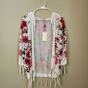 Jayley Silk Floral Kimono Cream White devore Jacket Coverup with Tassels Onesize