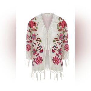 White kimono with vibrant floral embroidery and tassel details. Perfect for layering. Jayley Silk Floral Embroidered Cream devore Jacket Vintage onesize fit most.