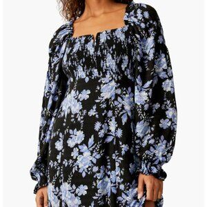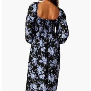 Floral-print midi dress with blouson sleeves has smocking at bodice, upper arm and back and a high-cut side slit to show off your heels. Color is Black Combo. Size XS.