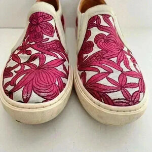 Jazmin Chebar Embroidered Slip-On Sneakers. In excellent condition. Has some wear to lower band. Leather trim, interior and rubber bottom. Beautiful floral embroidery floral design on shoes. Colors are fuchsia, silver and burgundy. Well designed shoe. Made in Argentina.