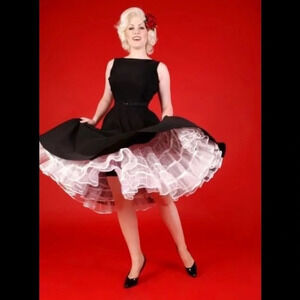 Simple yet sophisticated with its plain front a la Audrey Hepburn and distinctive white satin covered turn over back. Your bra is not visible. Made of high quality black stretch bengaline, you will have the fit you desire and the comfort you deserve. Just from the waist down ending in a flowing circle skirt. This is very flattering: the volume is not concentrated on the hips but at the end of the skirt! This dress comes with a thin removable faux leather belt which enhances your waist subtle. This classic dress fits every occassion and if you wear it with a petticoat - not included but available to purchase separately - it will add more 50s drama to it.