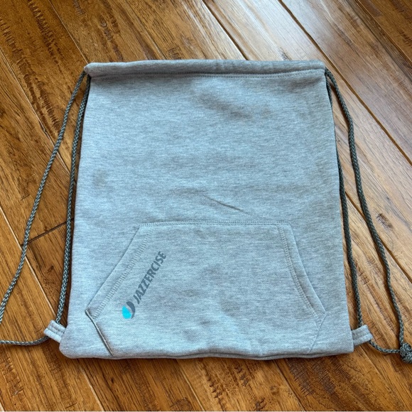 Stylish gray drawstring backpack with front pocket. Features Jazzercise logo.