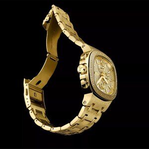 A nostalgic shape with modern finishes. The Heist features a rounded square case, embellished dial, 20 diamonds, and a multifunctional movement. A textured bracelet crafted in durable 18K gold-plated stainless steel, adjustable for a custom fit, completes the distinctive look.