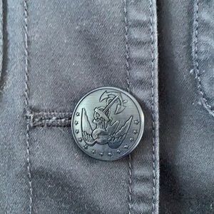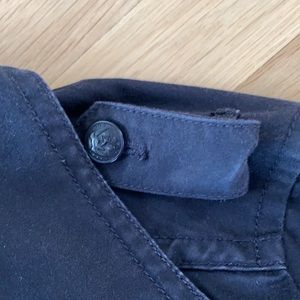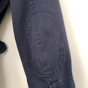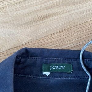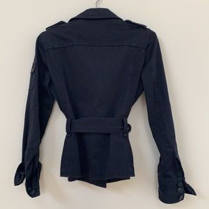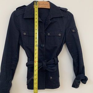 J.crew navy jacket 4 front pockets one on the left arm. Tie front tab detail on the shoulder. Patch elbows three button on the sleeve