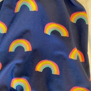 Adorable rainbow swim suit suit is a dark navy blue
