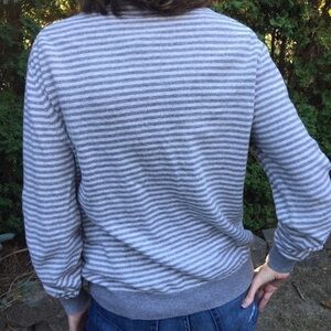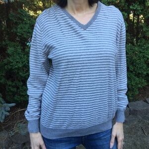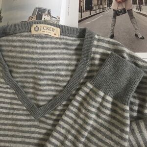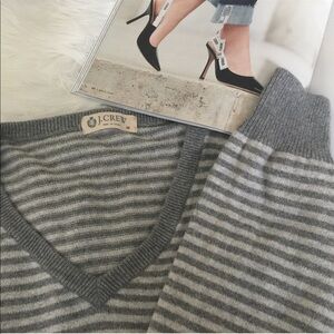 Super soft! Grey striped v-neck sweater by J.Crew. Material:92% Cotton 8% Cashmere. Excellent condition.