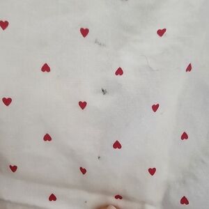 Size medium. white with tiny red heart button down. Jcrew. sweet ruffles on the top. slight stain on the lower right of blouse (tinier than the hearts). wont show when blouse is tucked in.