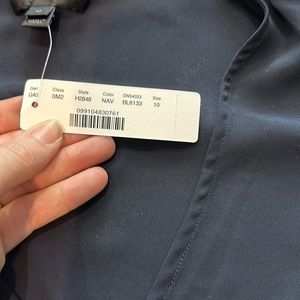Vneck, ruffle arms, navy blue, poly, never worn