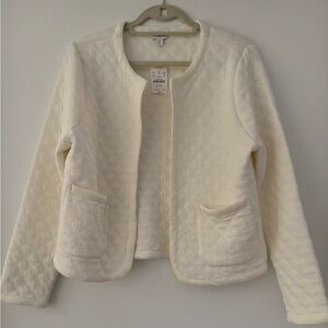 Slightly loose fit. Hits at hip 60% cotton/40% polyester. Long sleeves Patch pockets Inside hook closure