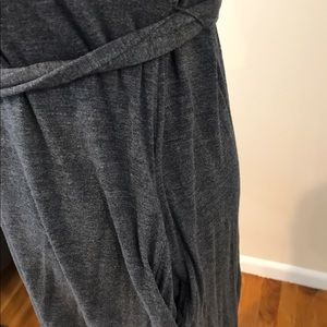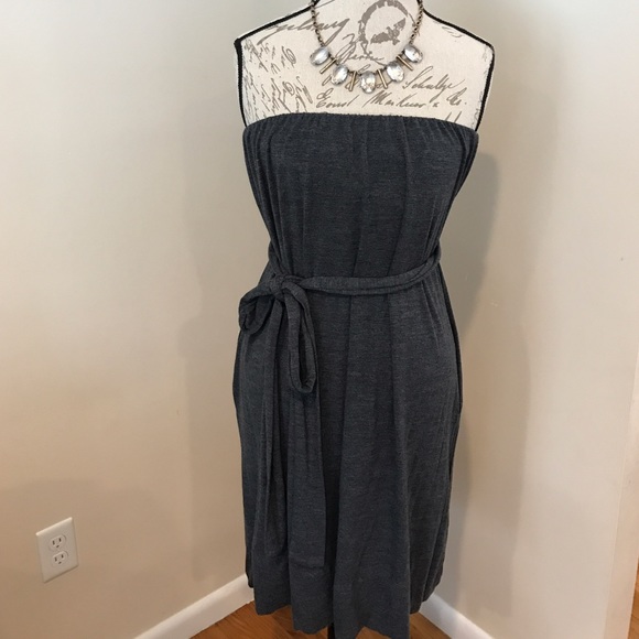 Charcoal gray strapless, tie belt, pockets. Excellent used condition.